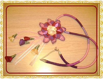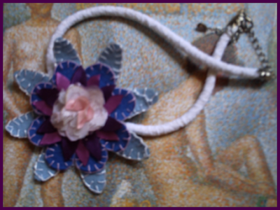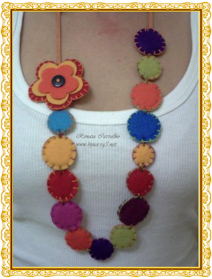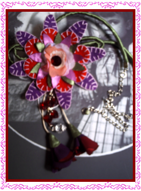 Eu particularmente gosto muito de misturar feltro com outros materiais. A flor abaixo que confeccionei, tem três funções, como você poderá observar no avesso do trabalho. Ela pode ser usada como pingente de gargantilha ou cola r, como broche e também comopresilha de cabelo. Suuuuper versátil!